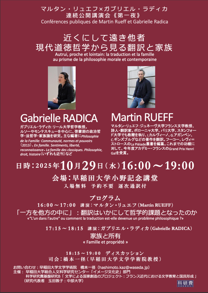 主催: 早稲田大学総合人文科学研究センター「イメージ文化史」部門;科学研究費基盤研究B「文学による国家創造のプロジェクト:フランス近代における文学教育と国民形成」(研究代表者 玉田敦