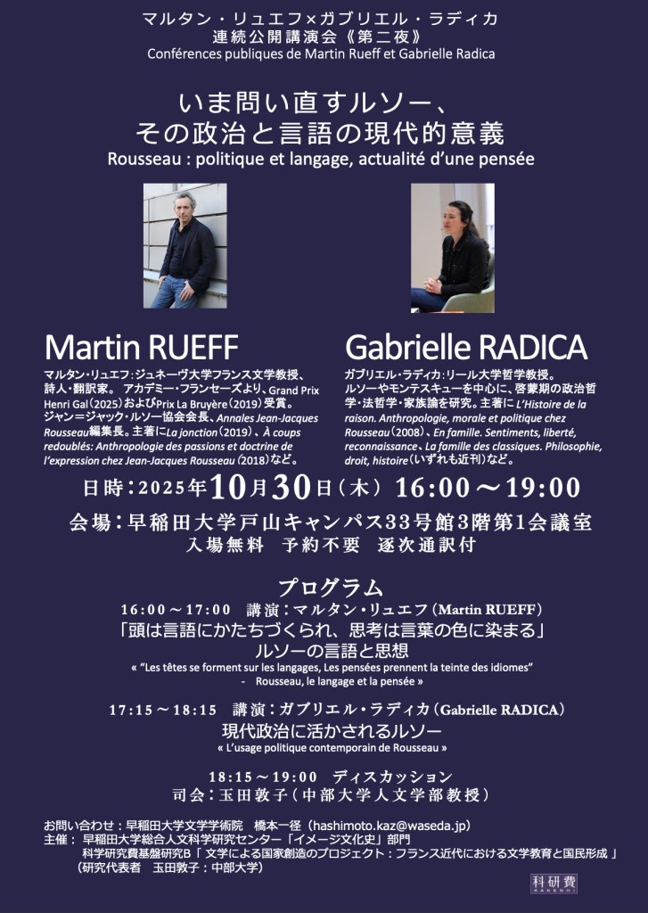 マルタン・リュエフ(Martin RUEFF):ジュネーヴ大学フランス文学教授、詩人・翻訳家。ボローニャ大学、パリ大学、スタンフォード大学でも教鞭を執り、イタロ・カルヴィーノ、ジョルジョ・アガンベン、カルロ・ギンズブルグなどの著作を翻訳。ミシェル・フーコー、クロード・レヴィ=ストロースのLa Pléiade叢書を編纂。これまでの功績に対して、今年度アカデミー・フランセーズのGrand Prix Henri Galを受賞。